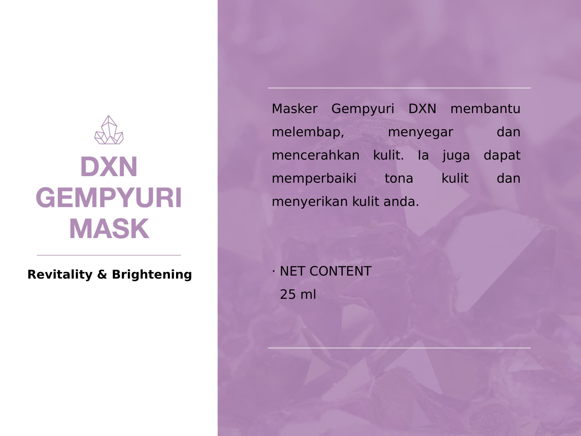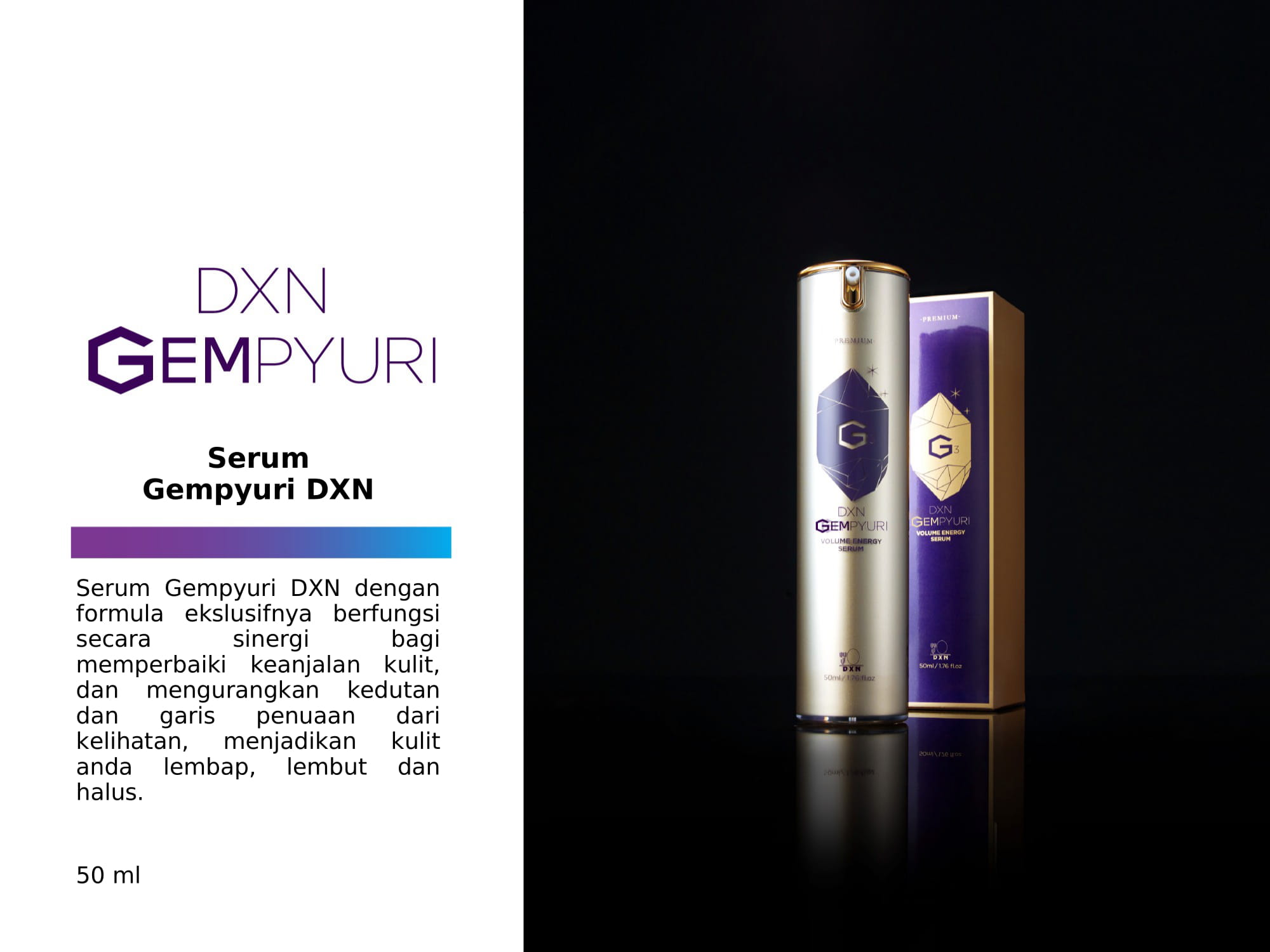 Serum Gempyuri DXN dengan formula ekslusifnya berfungsi secara sinergi bagi memperbaiki keanjalan kulit, dan mengurangkan kedutan dan garis penuaan dari kelihatan, menjadikan kulit anda lembap, lembut dan halus.