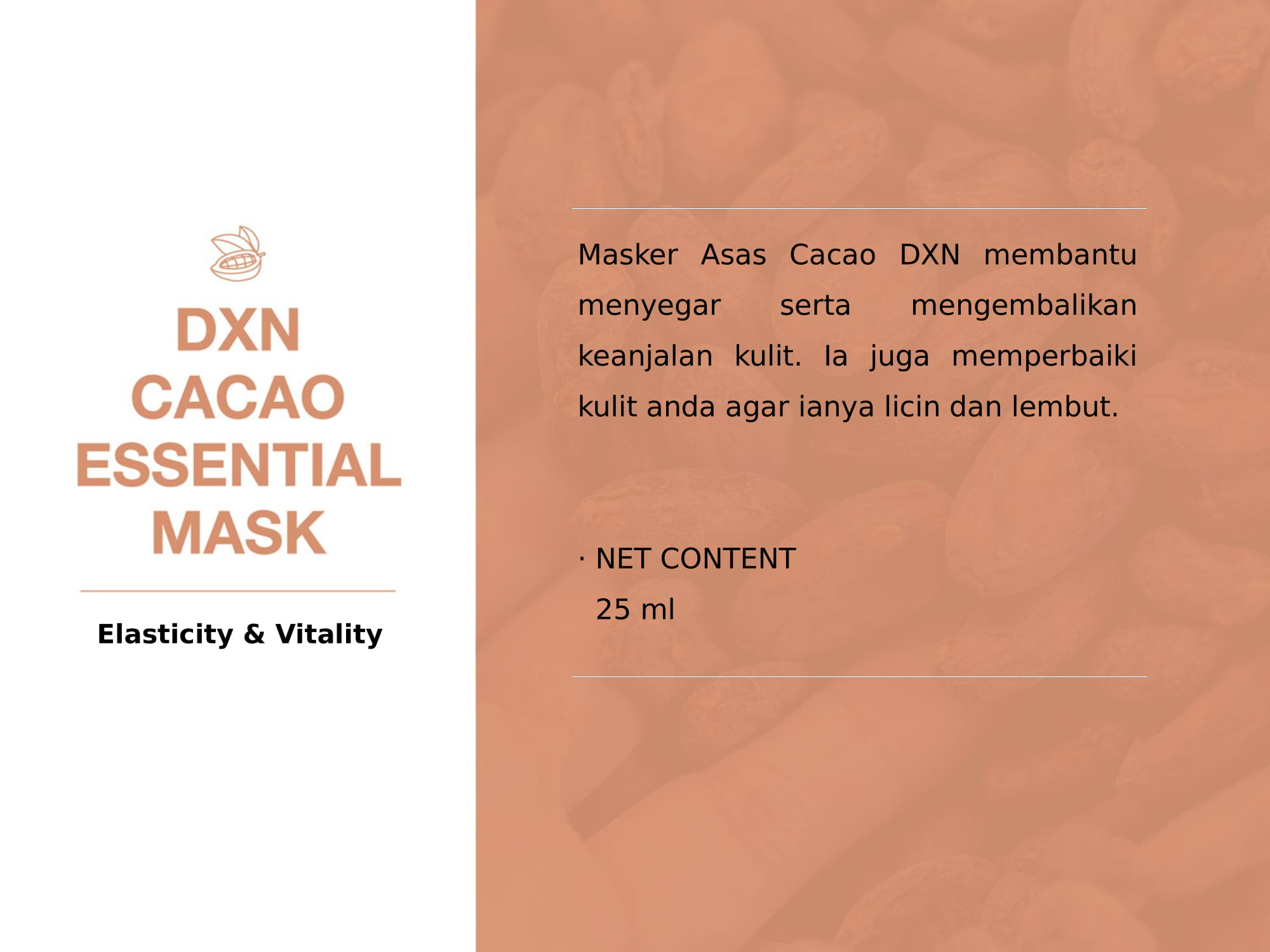 Kukuhkan langkah anti-penuaan anda dengan DXN Anti-Aging Face Mask. Masker dalam bentuk serbuk ini dirumus unik dengan bahan mesra kulit seperti serbuk buah Morinda citrifolia, ekstrak cendawan Ganoderma lucidum, serbuk Spirulina platensis dan serbuk biji Kopi Robusta untuk membantu meremajakan dan memberikan nutrisi kepada kulit anda, menjadikannya lebih anjal dan segar. Nikmati pengalaman seperti di spa di rumah anda hanya dengan beberapa langkah mudah untuk kulit yang lebih segar dan tampak lebih muda.
