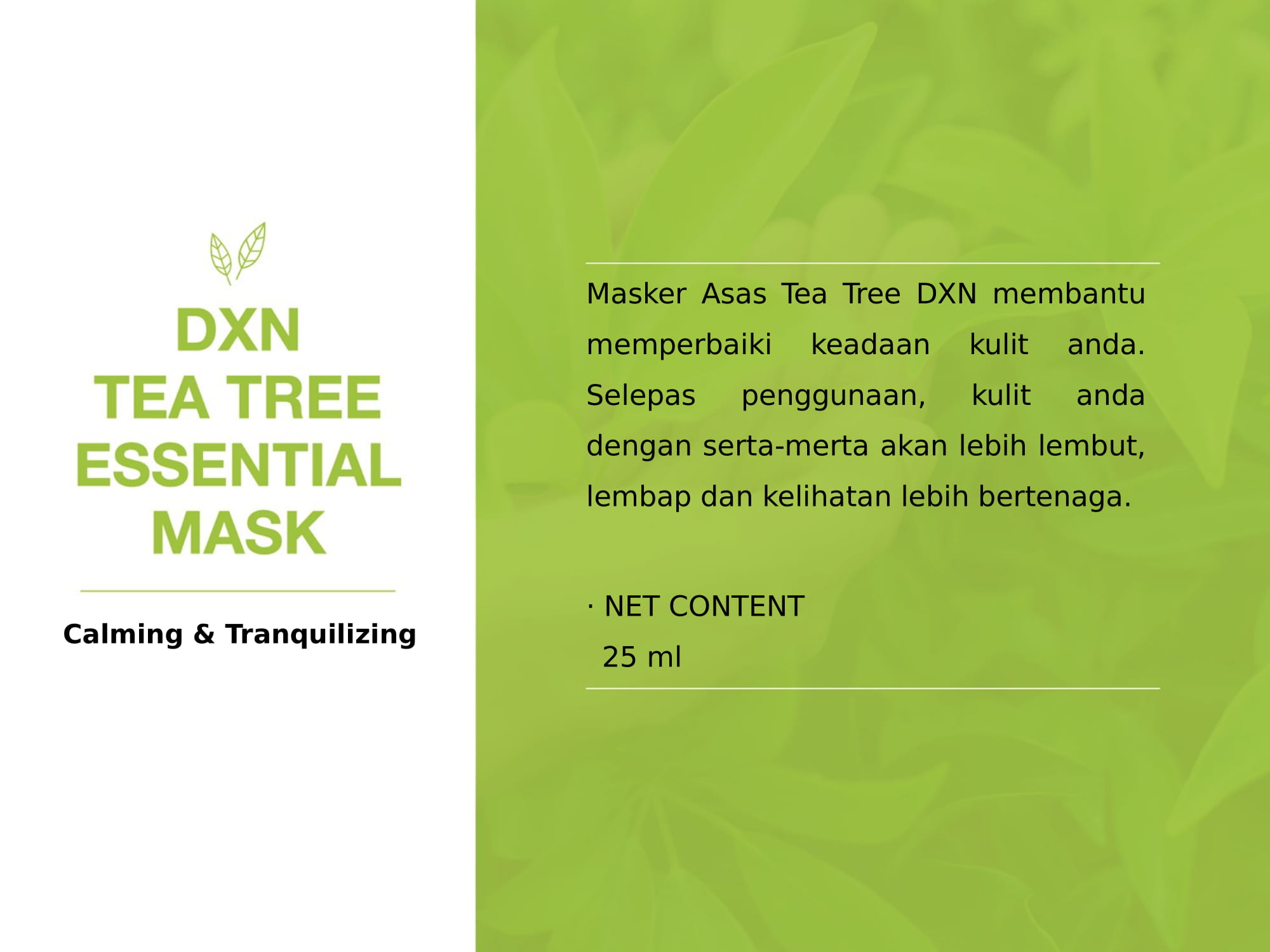 DXN Oolong Tea Mask didatangkan khas dalam dalam bentuk serbuk, membolehkan anda merasai kesegaran masker wajah dalam setiap bancuhan.Nikmati kebaikan semula jadi teh Oolong dan tanah liat untuk kulit yang lebih segar dalam setiap penggunaan.